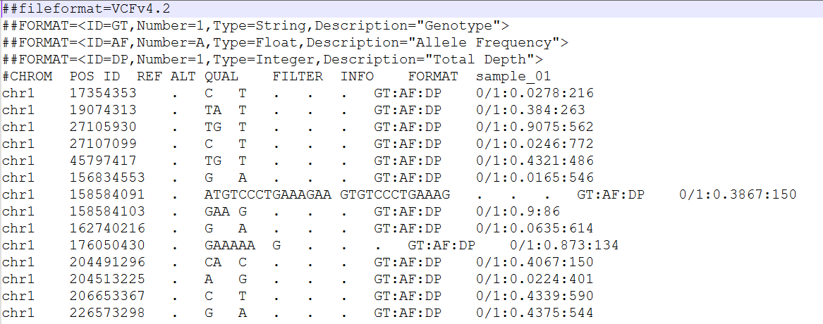 The table typically includes columns like CHROM, POS, ID, REF, ALT, QUAL, FILTER, INFO, FORMAT, and one or more sample names. The values in the sample columns follow the formatting specified by the FORMAT field.